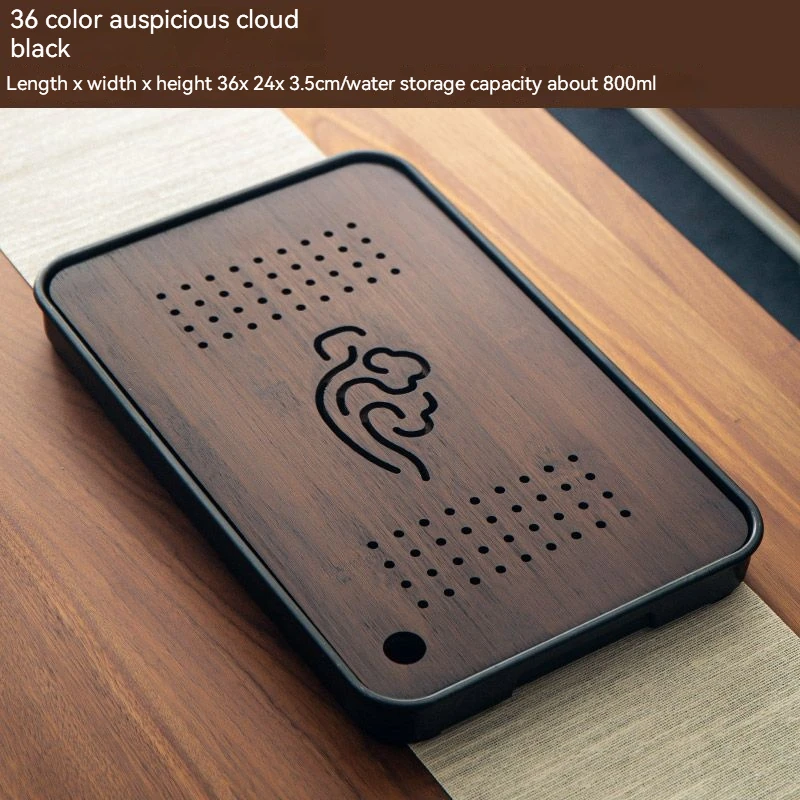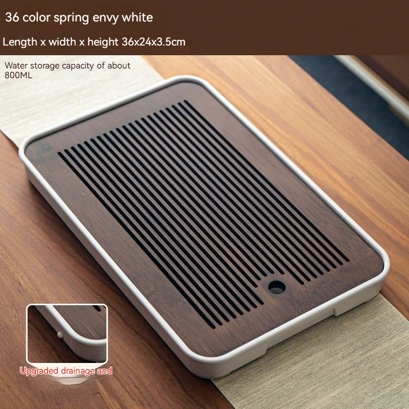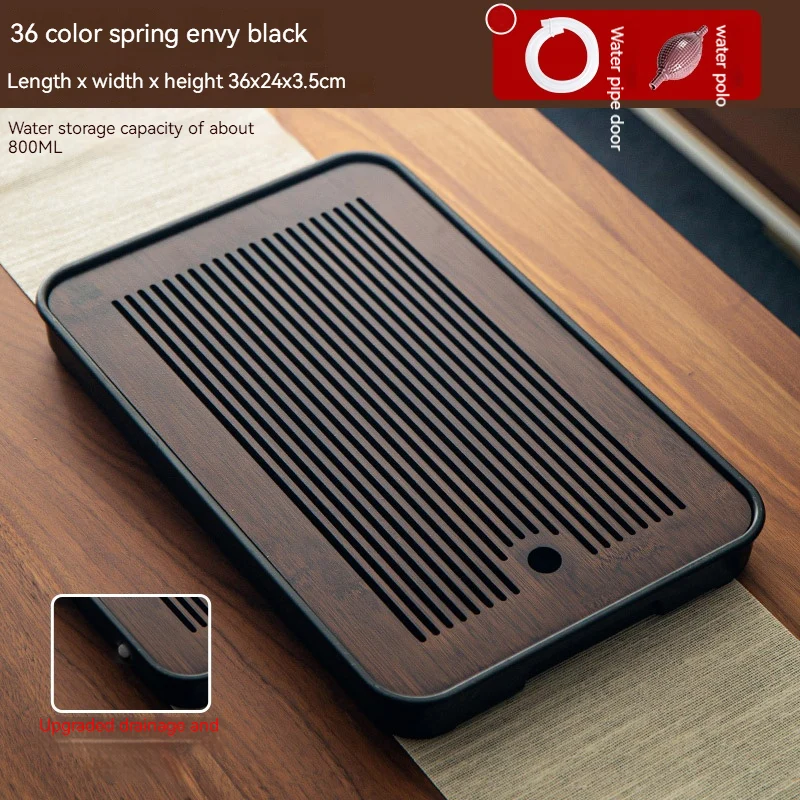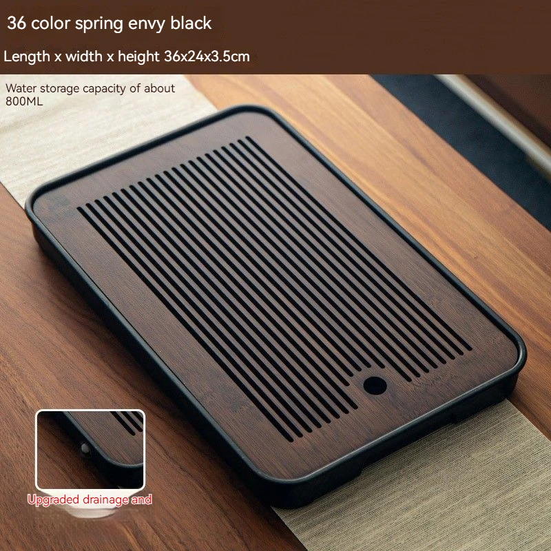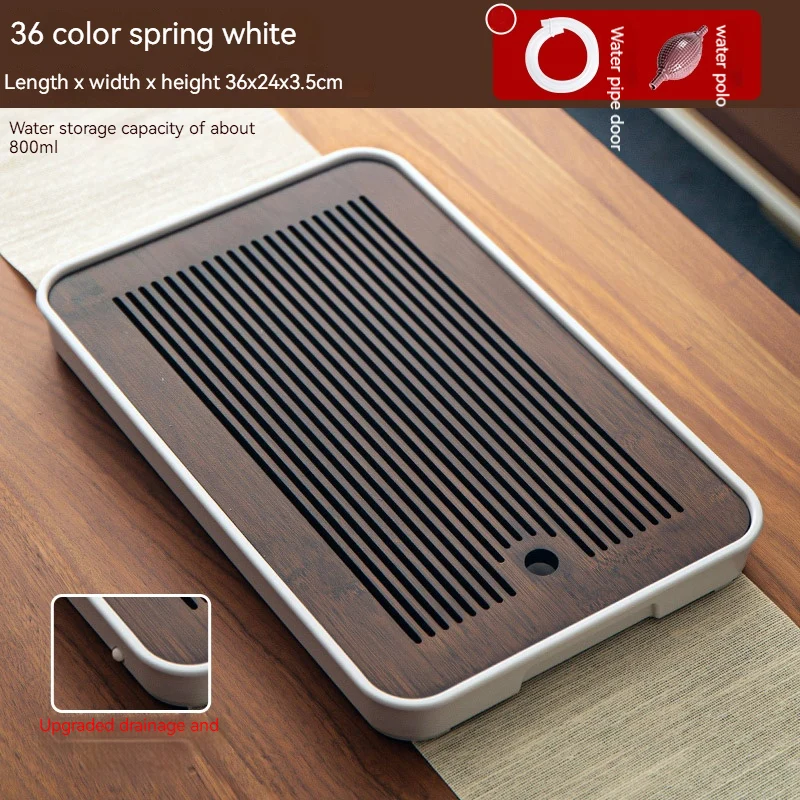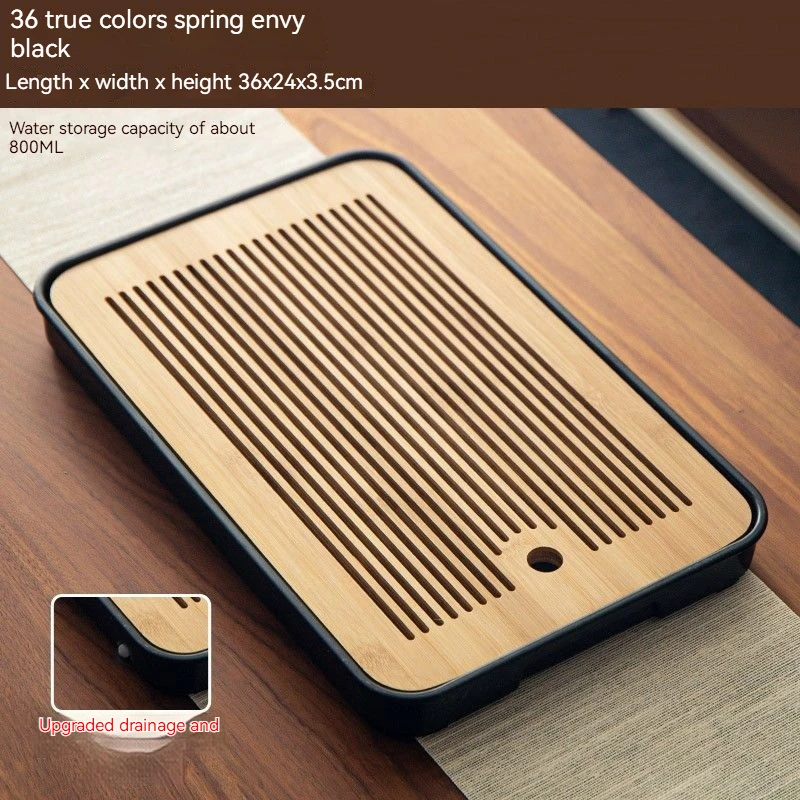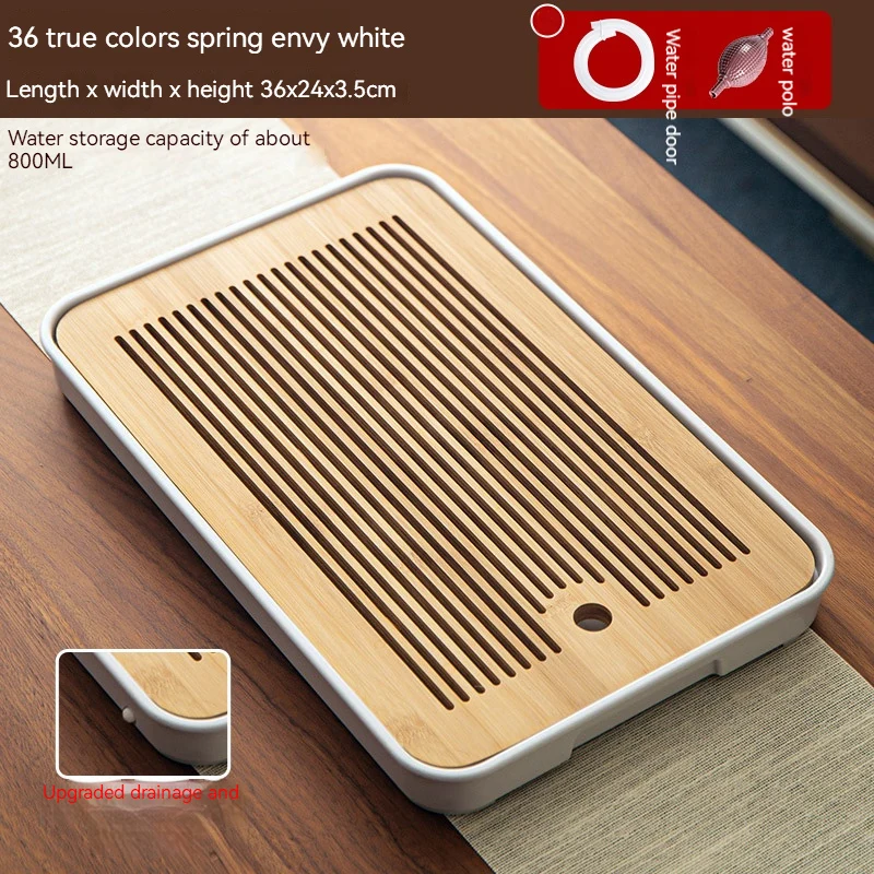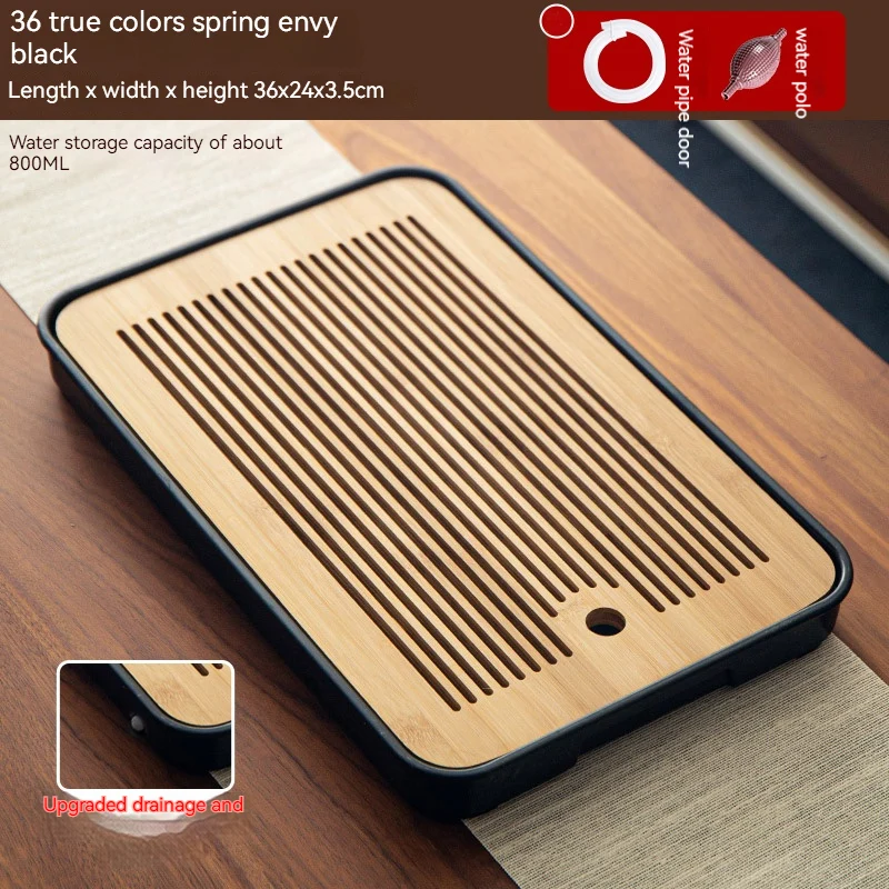 هذه صينية شاي مصنوعة من الخيزران مصممة لتصريف المياه وتستخدم لتقديم الشاي في المنزل أو في أماكن أخرى.