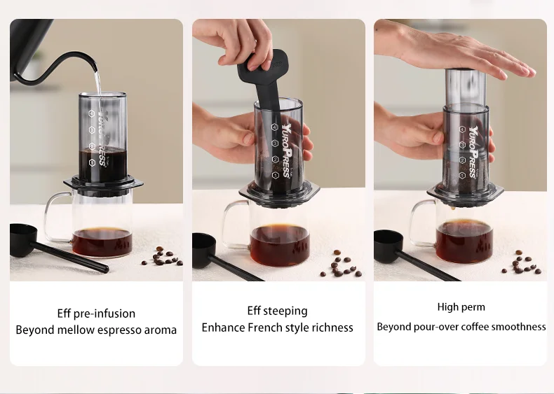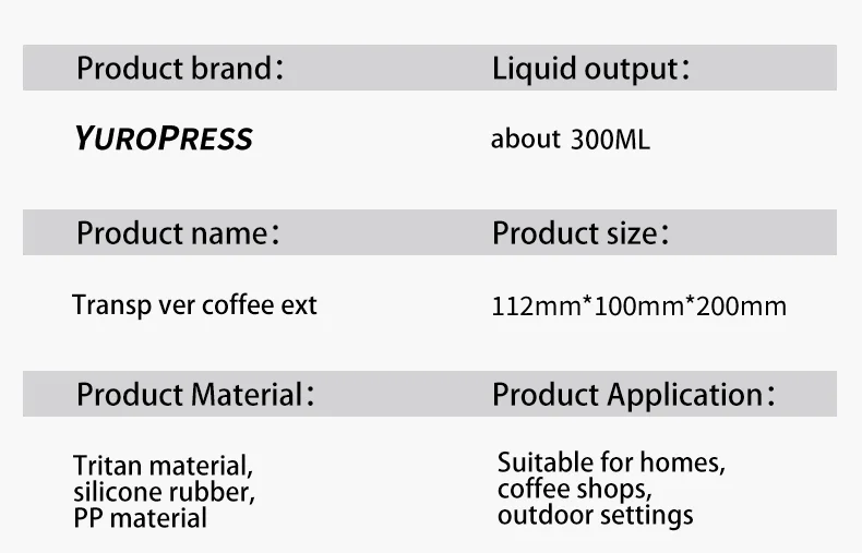 1.مادة تريتان التي تمت ترقيتها حديثًا والمستوردة من الولايات المتحدة تكون درجة الأم والطفل أكثر أمانًا ومتانة، مع مقاومة للحرارة تصل إلى 109° ج دون إطلاق أي سمية، وسعة حوالي 300 مل لاستيعاب المزيد من القهوة المطحونة.اصنع نكهة القهوة الخاصة بك.