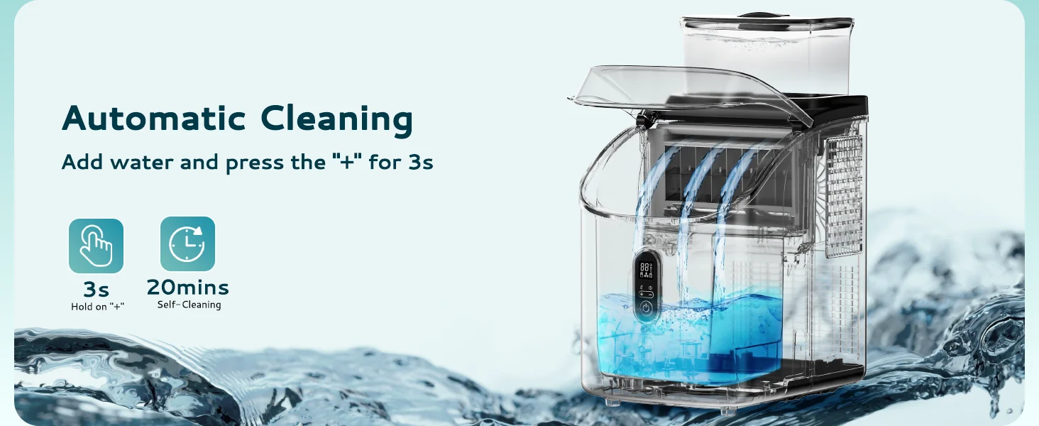 Featured with auto Red Warning indicator on Water Shortage, Ice full storage; Also holding the "Ice/Clean" button for 5 seconds can activate the auto-cleaning program.