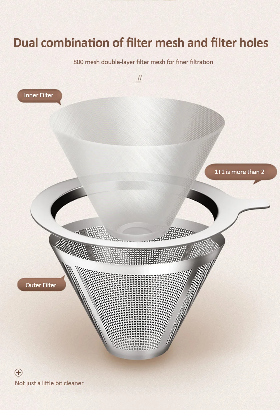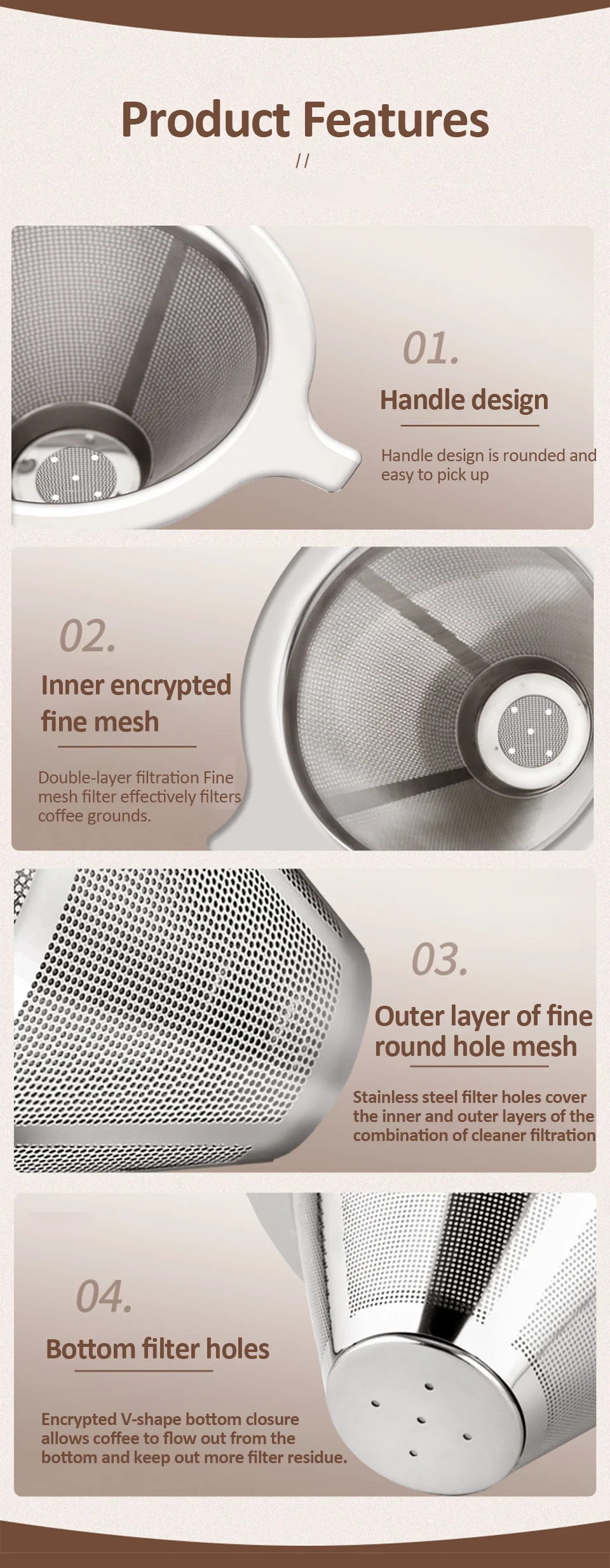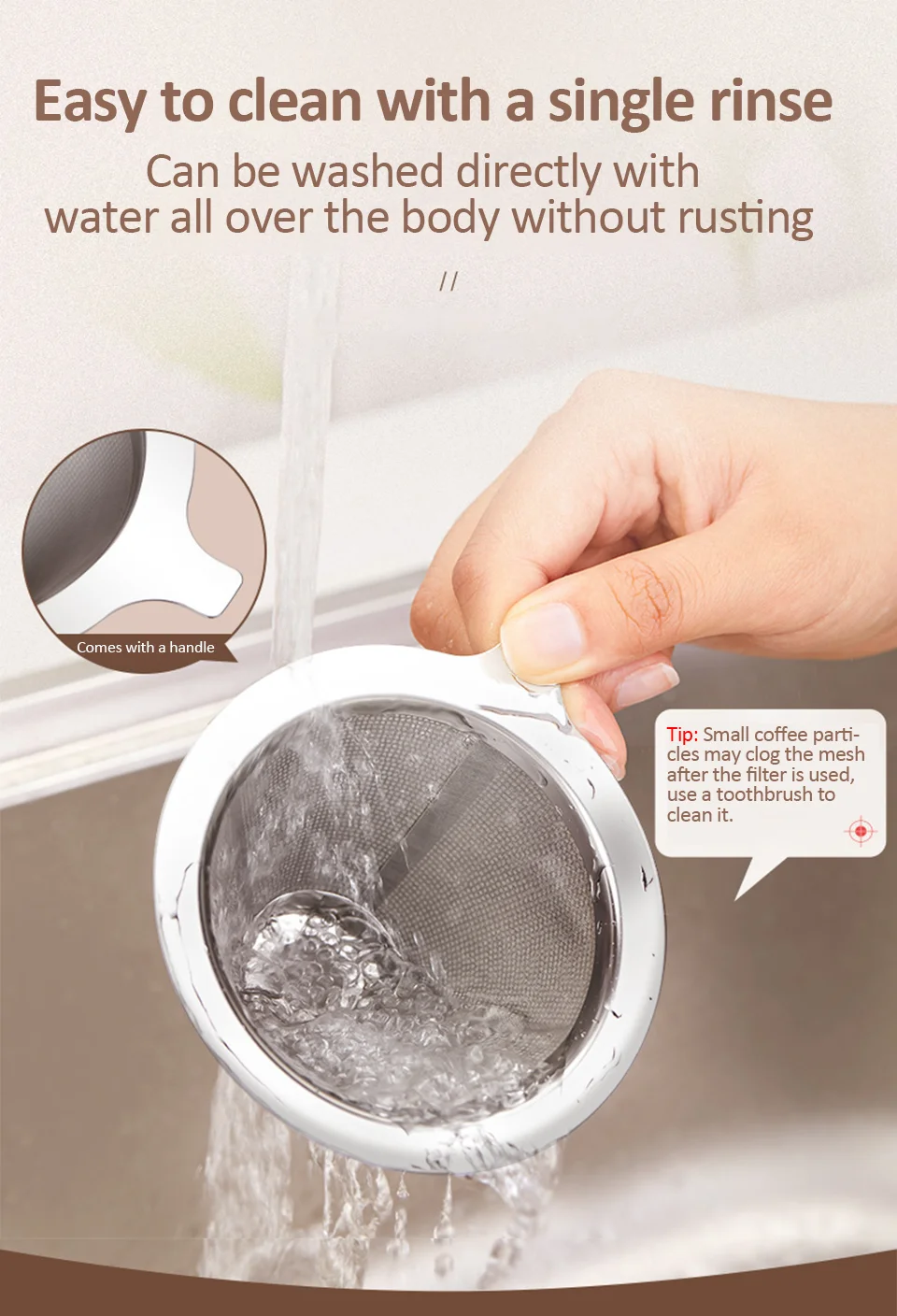 -Double layer design: This stainless steel coffee filter adopts a double-layer design, without the need for filter paper, ensuring efficient filtration and excellent durability while saving filter paper.
